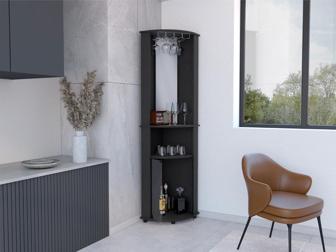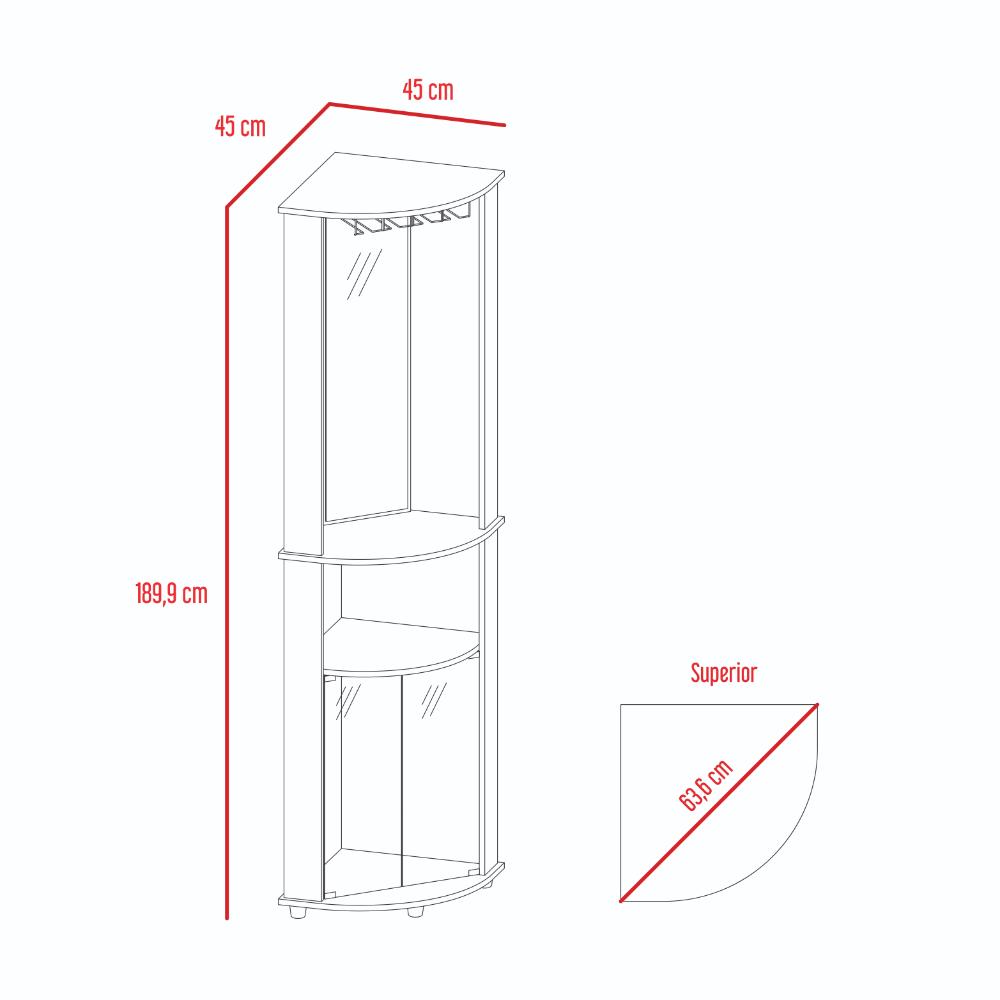 Bar, con colgador de copas, dos puertas de vidrio, espejo, espacio para almacenar botellas y objetos del bar.