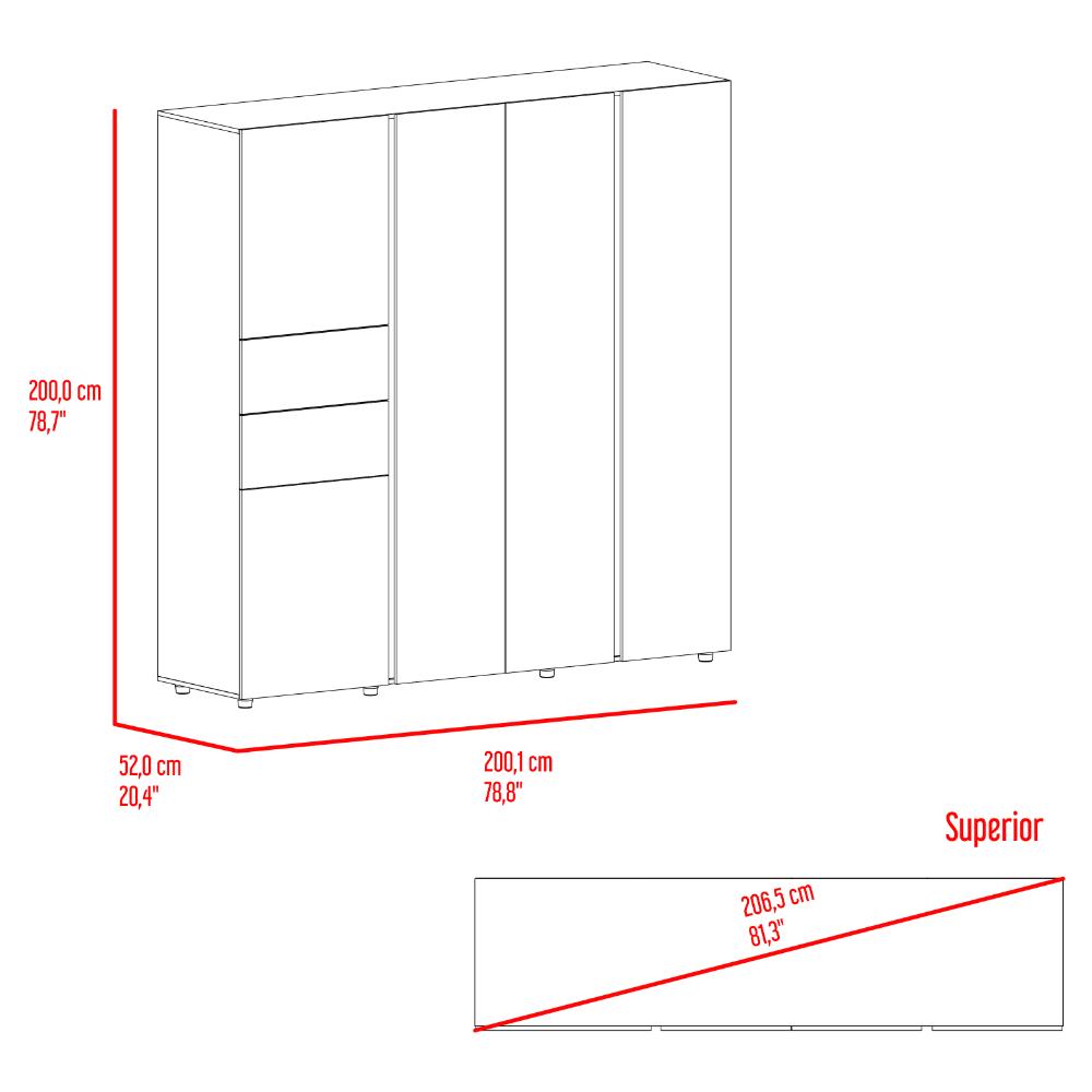 Closet, con seis puertas batientes, dos cajones, dos tubos para colgar ropa y amplios espacios de guardado.