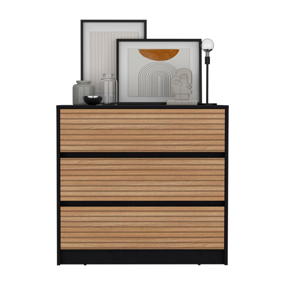 Organizador, con tres amplios cajones deslizadores para guardar objetos personales, espacio superior para objetos decorativos, manijas y rieles metálicos.