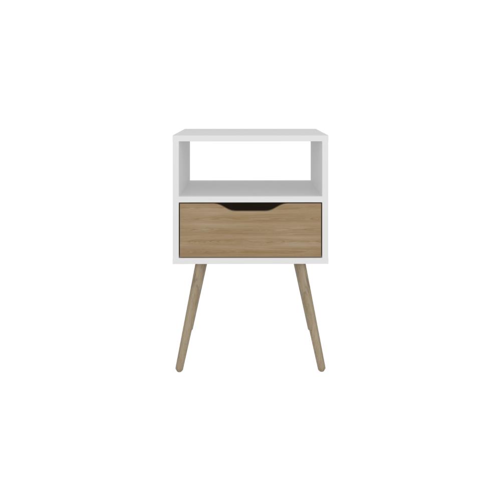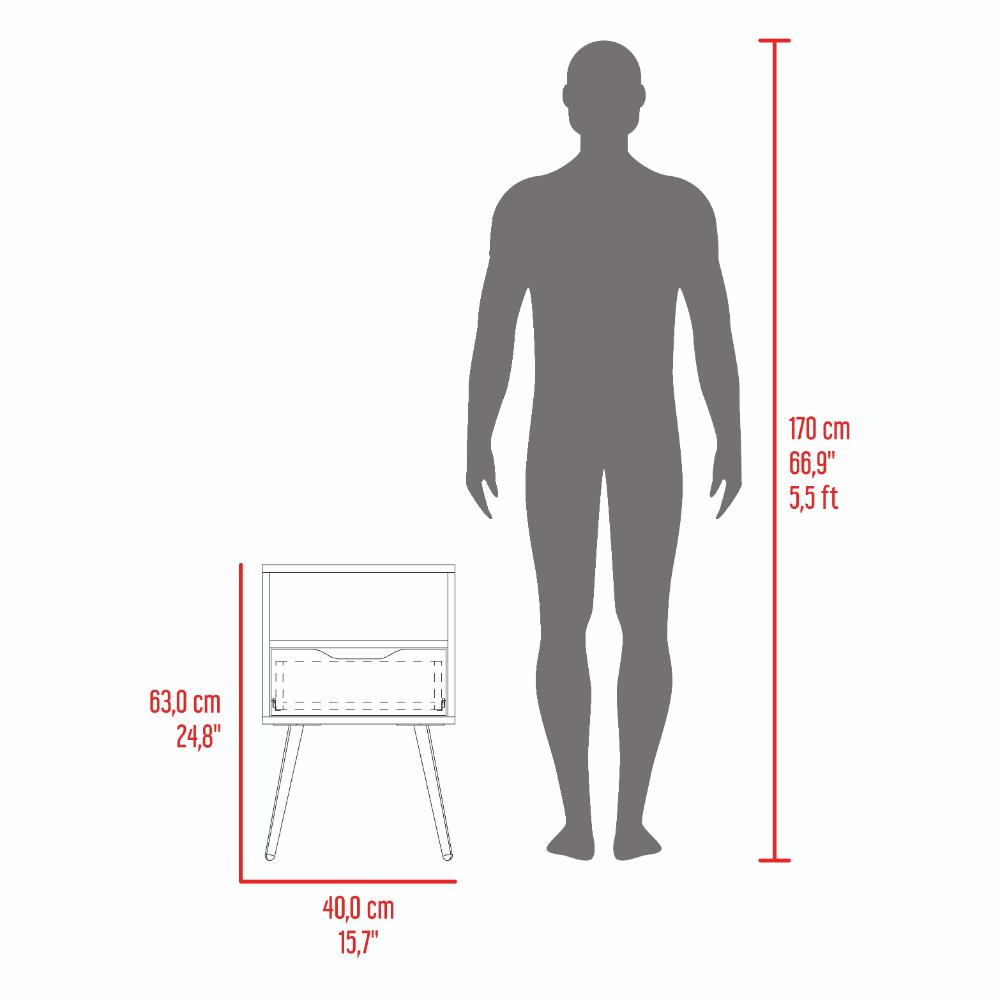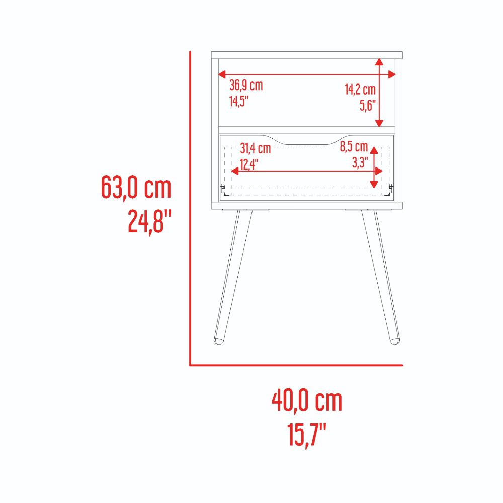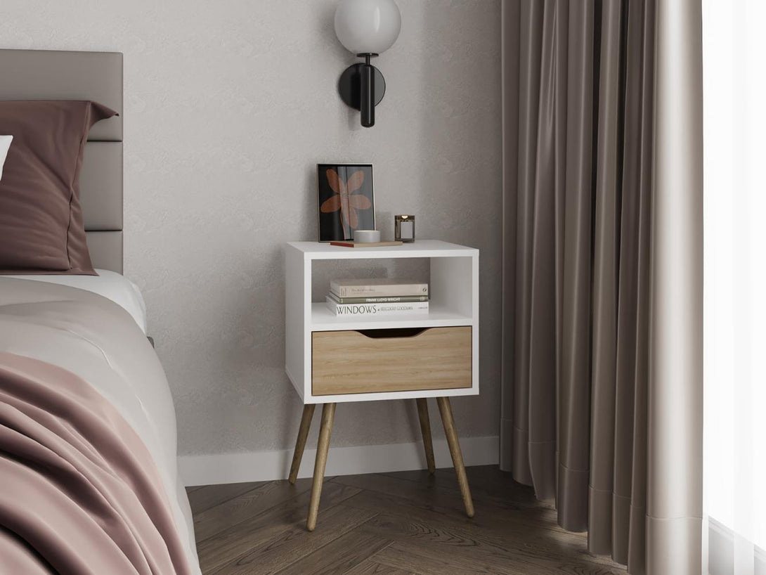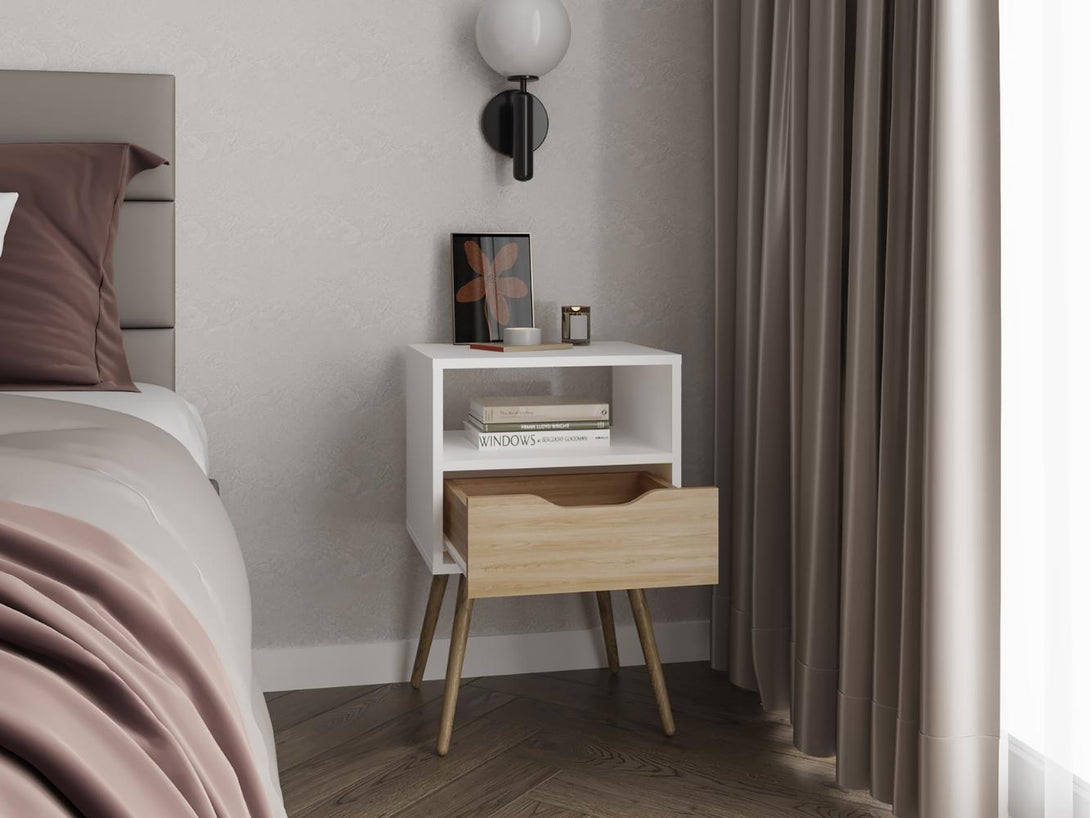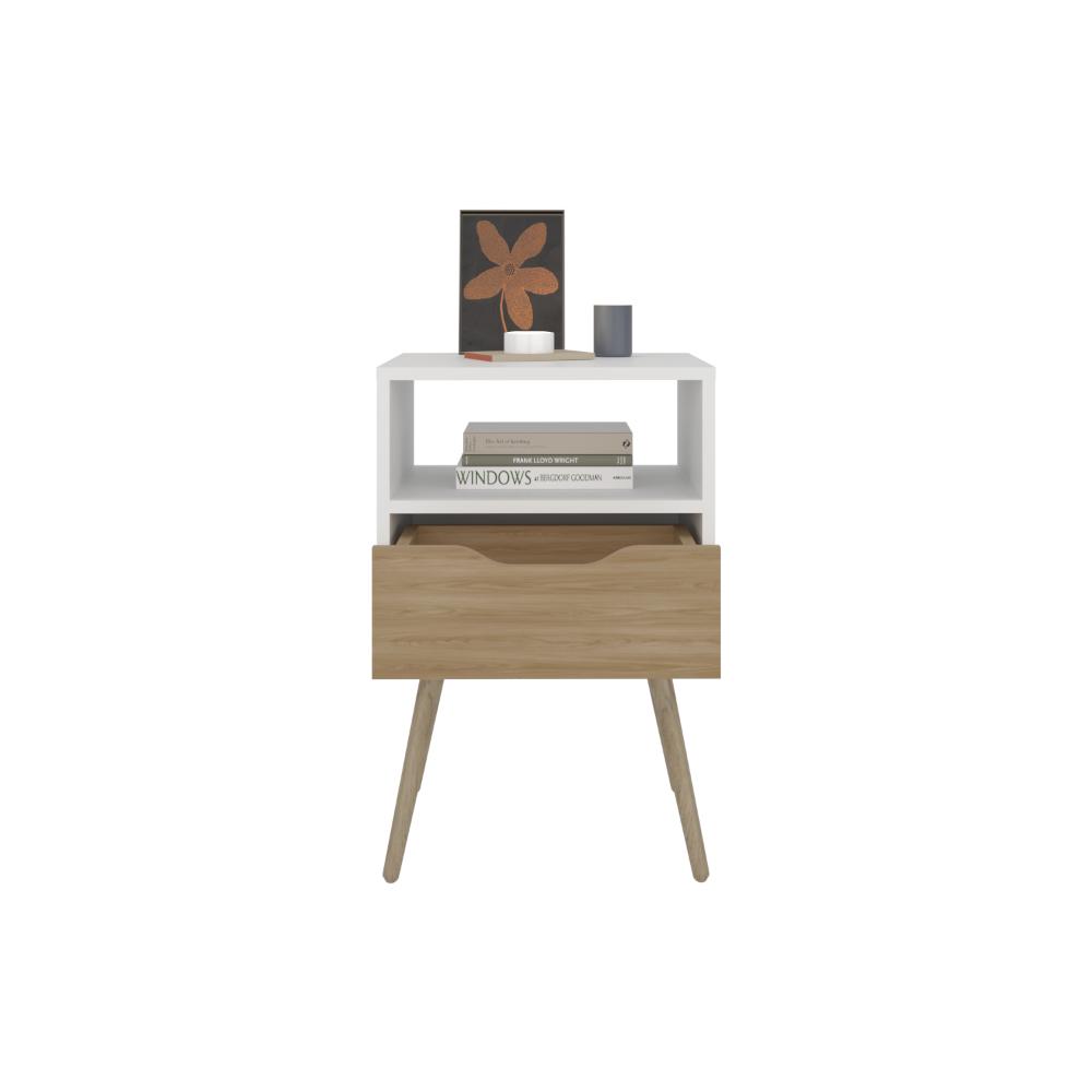 Mesa de Noche Alesio, Blanco Duqueza y Fresno Europeo, con Patas en Madera y un Cajón