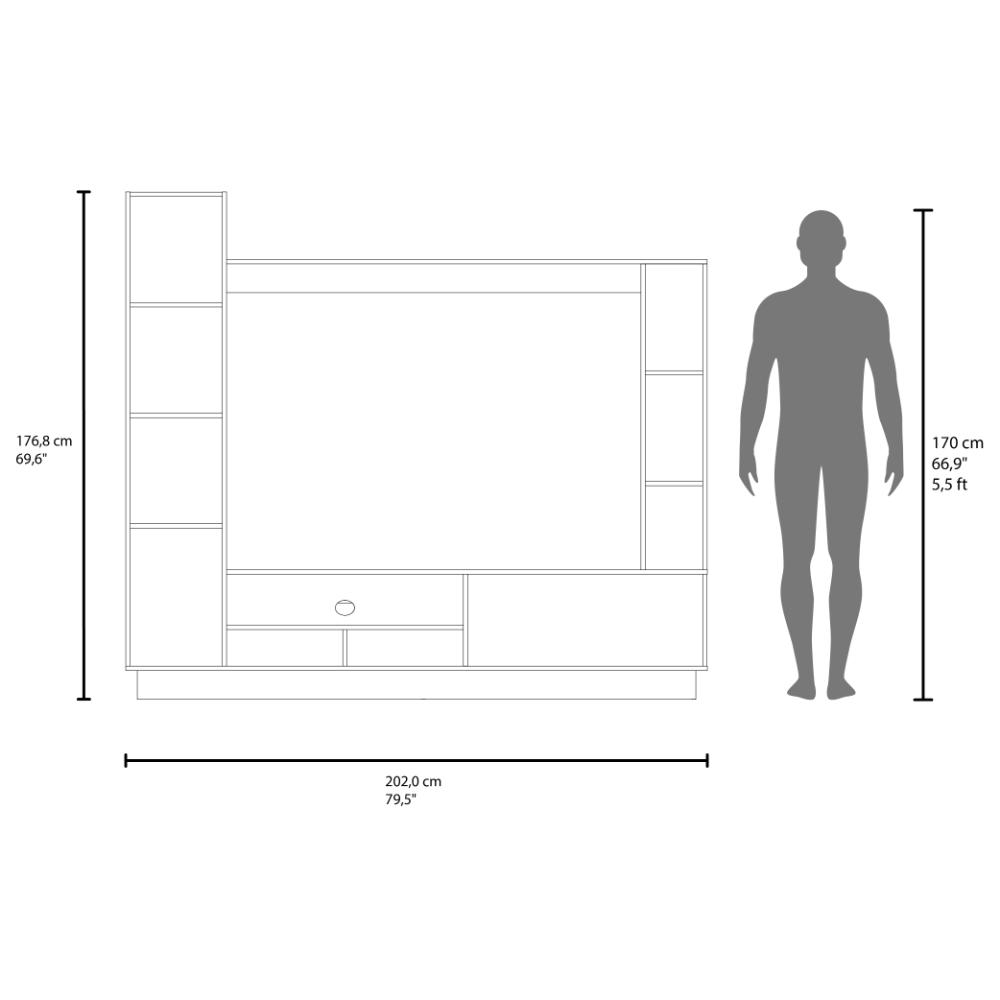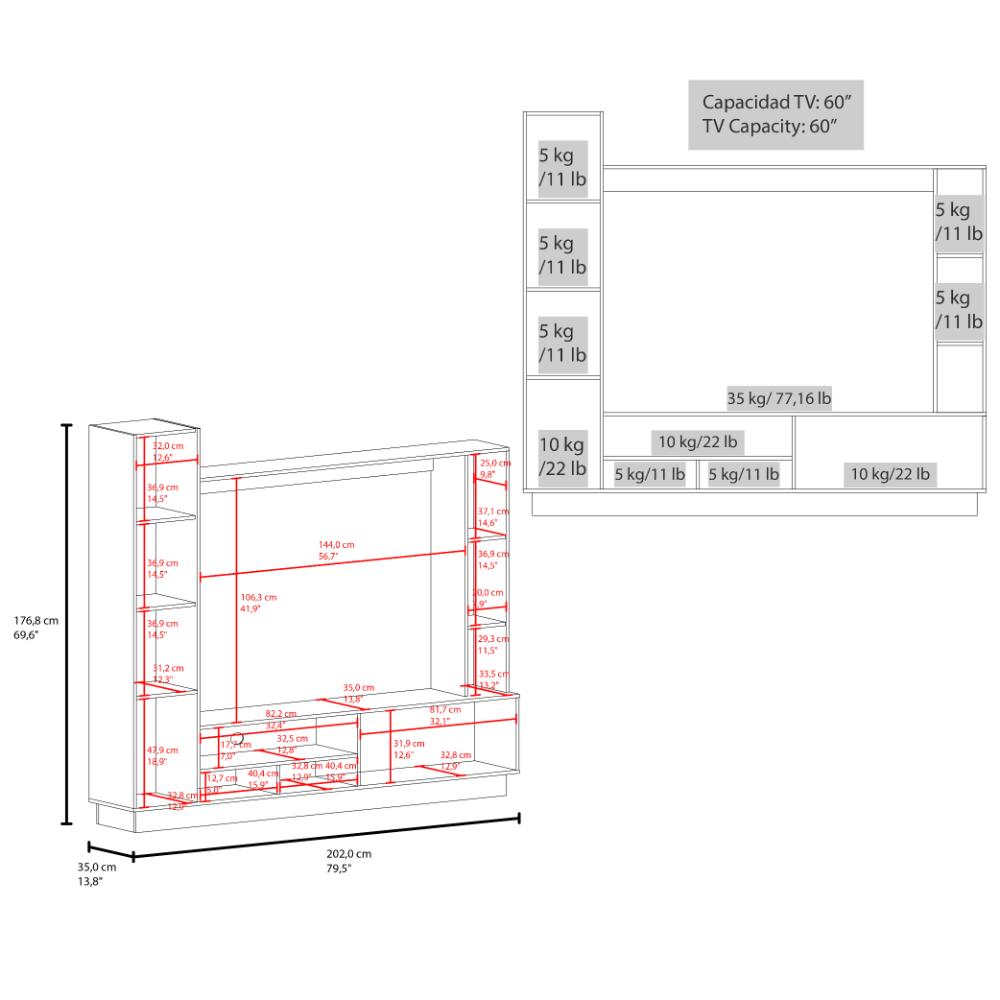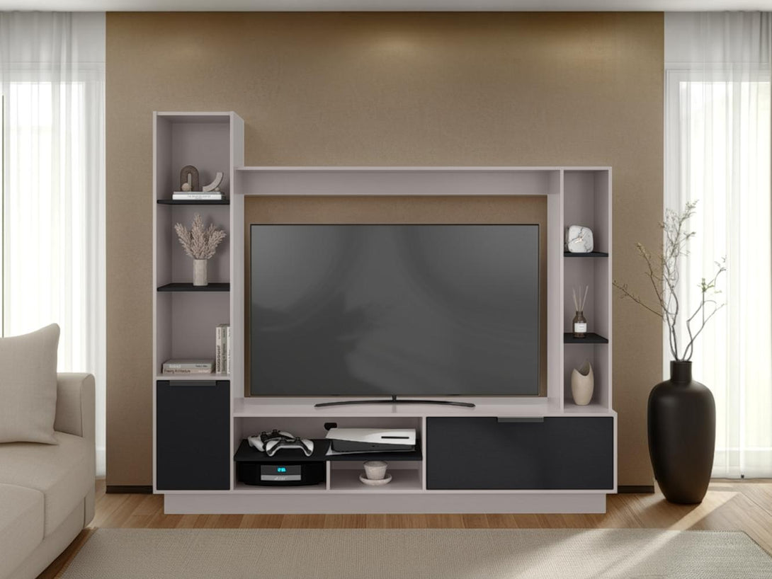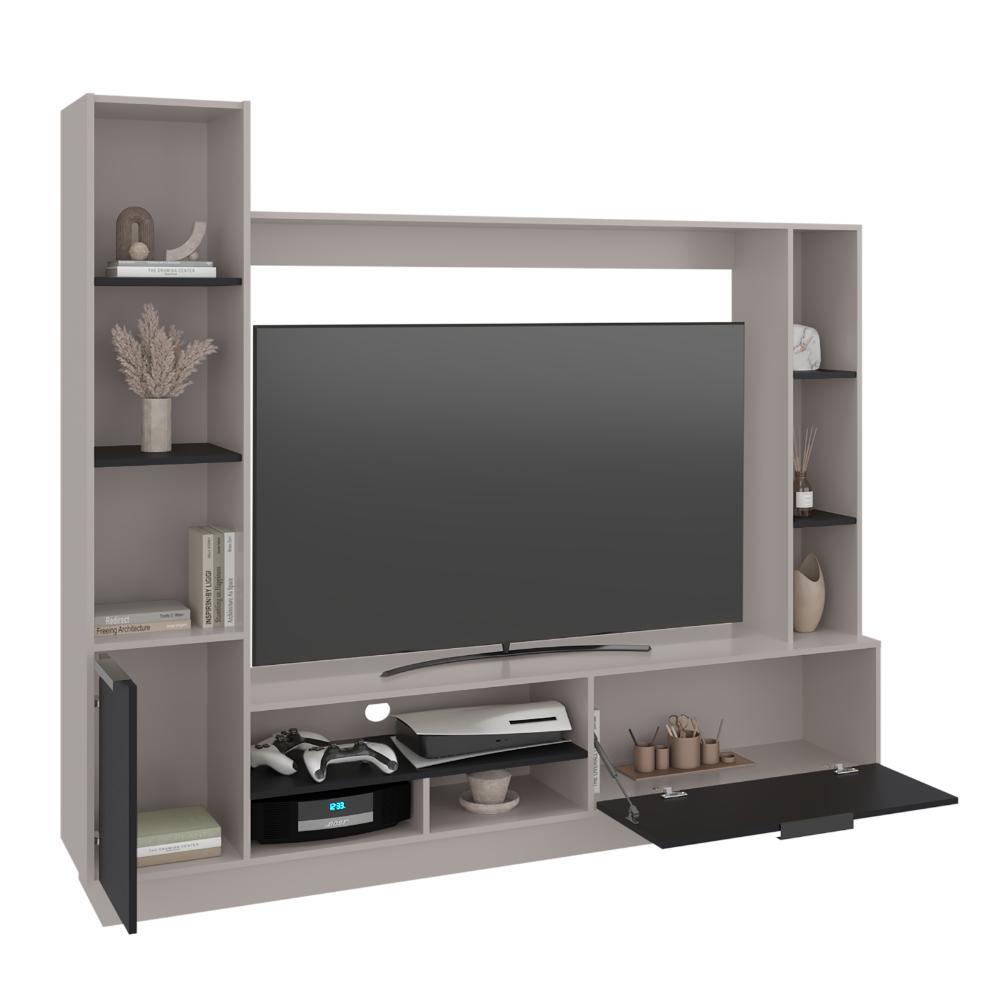 Mesa de TV, con espacio para televisor de hasta 60". Diseño moderno con bellísima combinación de colores. Múltiples compartimientos y superficies para ubicar objetos.
