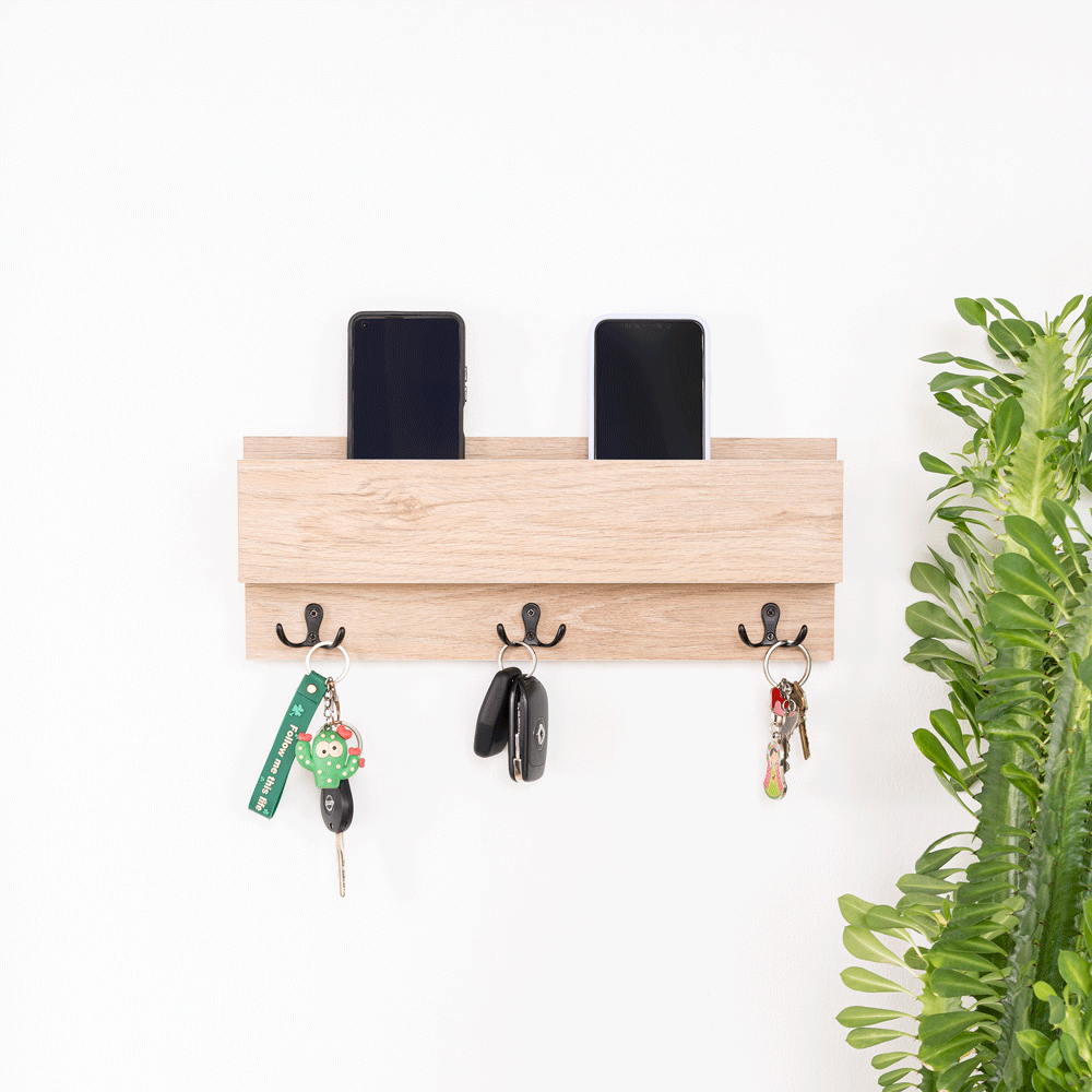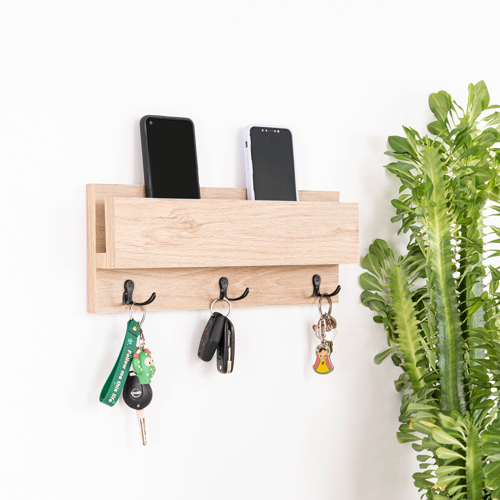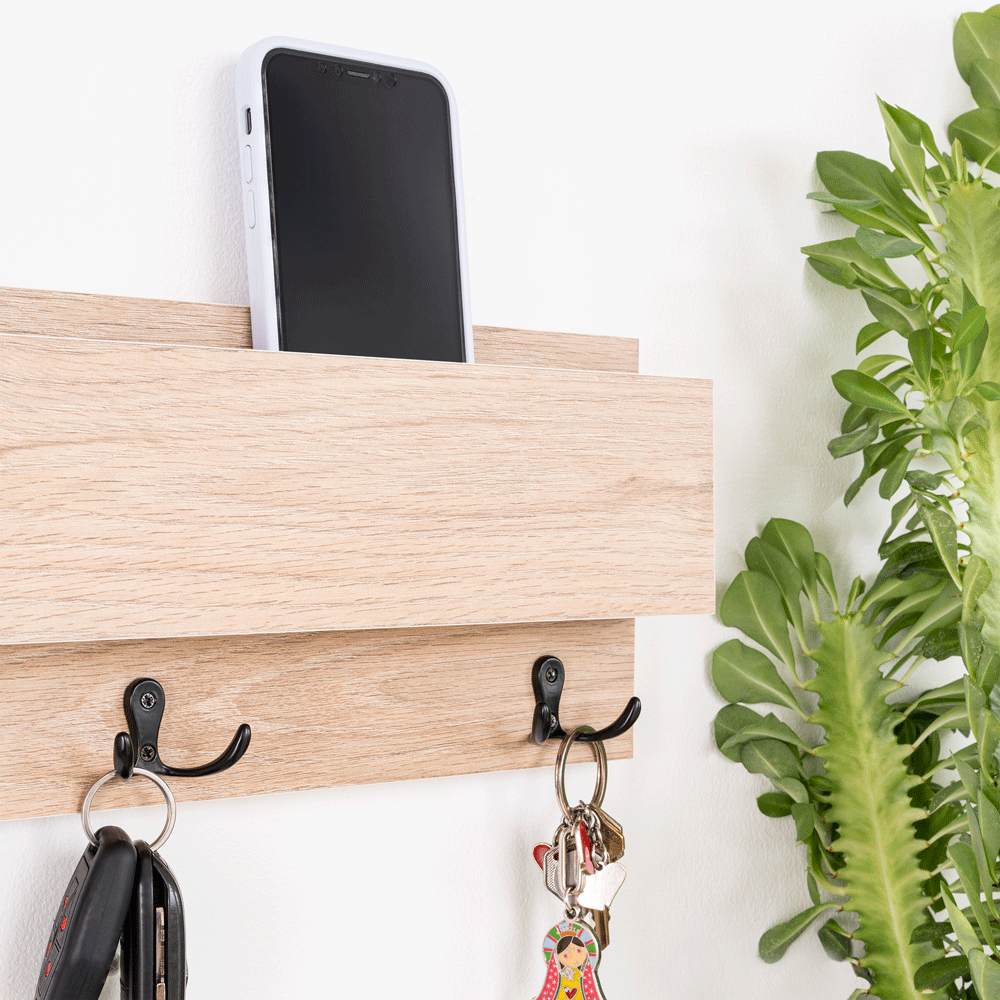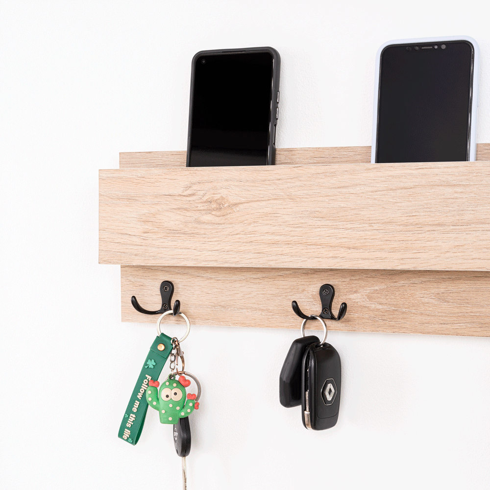 Repisa con 3 ganchos para colgar llaves o accerios y poner el celular; no requiere armado, incluye chazos para instalación a pared.