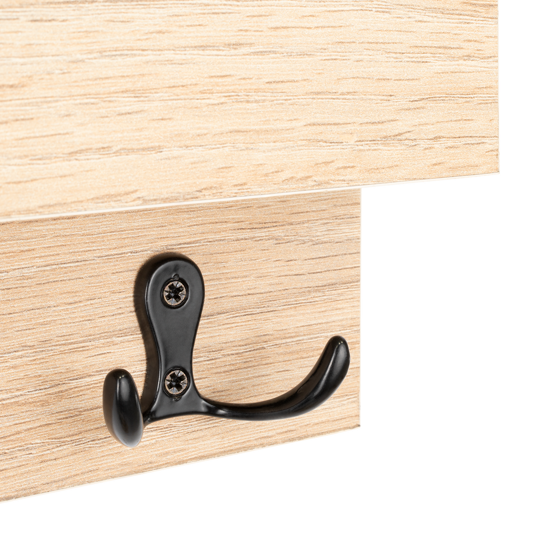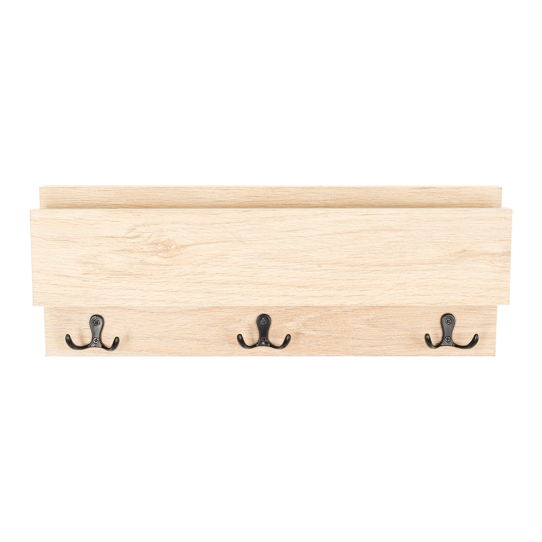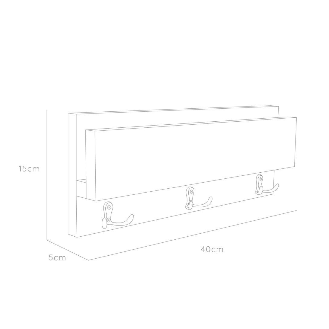 Repisa con 3 ganchos para colgar llaves o accerios y poner el celular; no requiere armado, incluye chazos para instalación a pared.