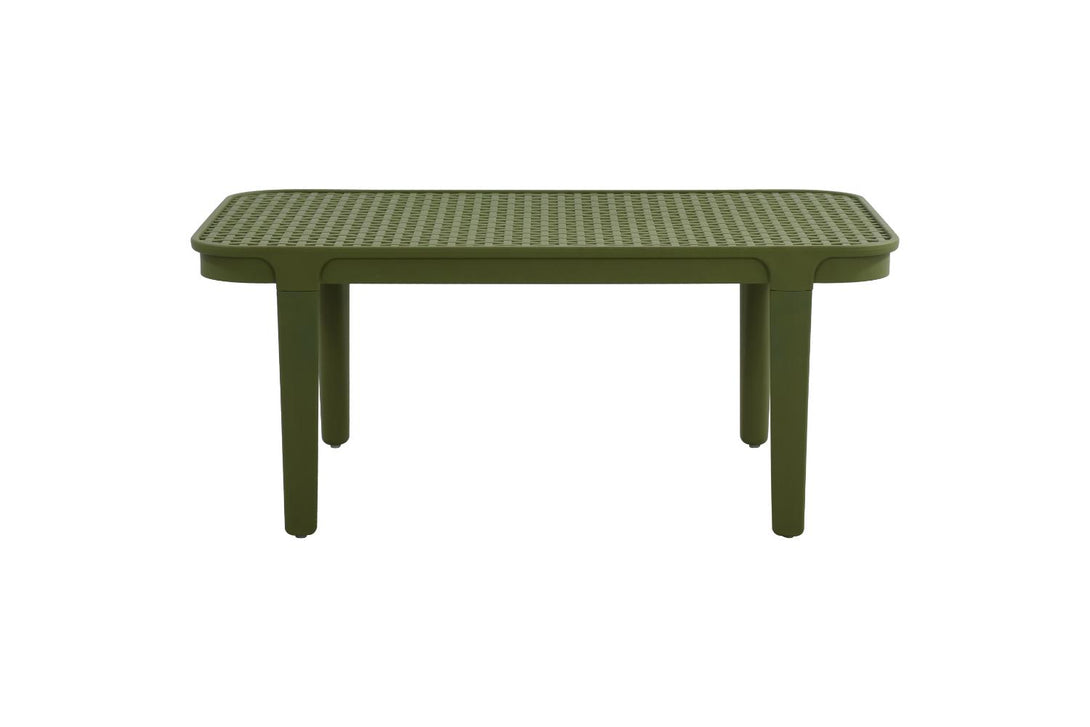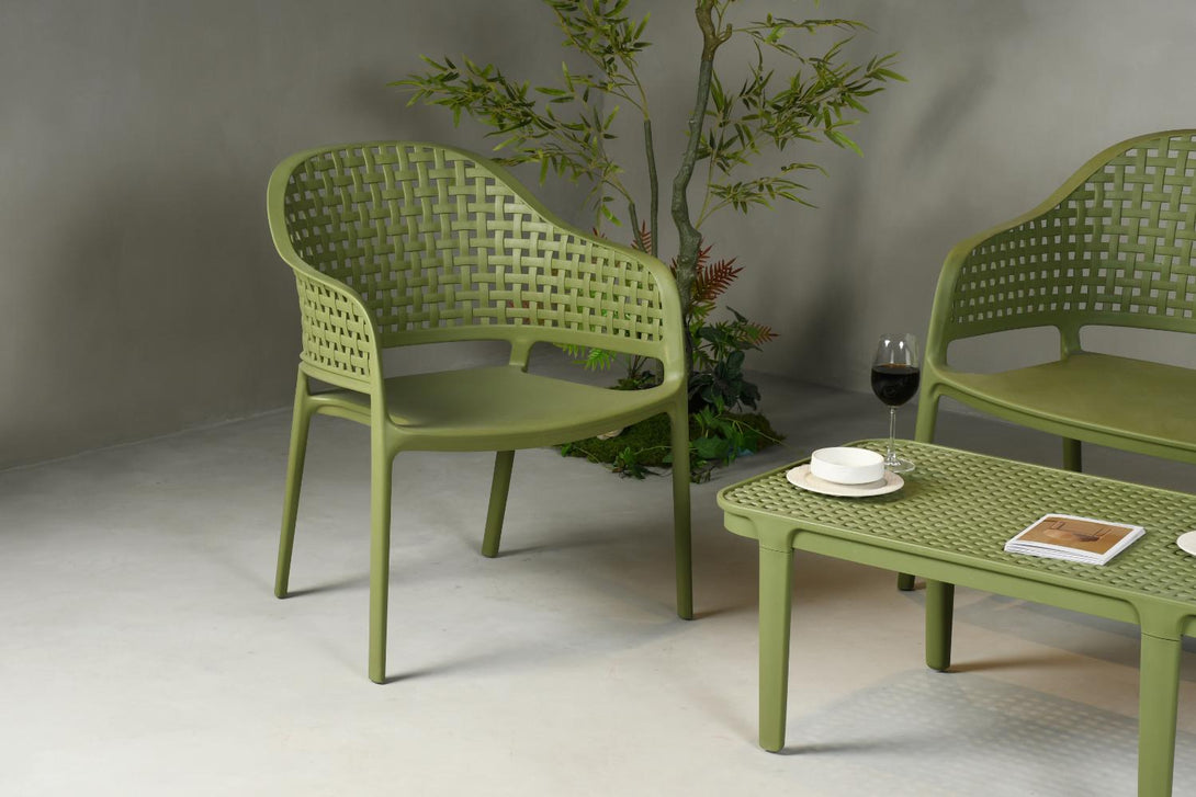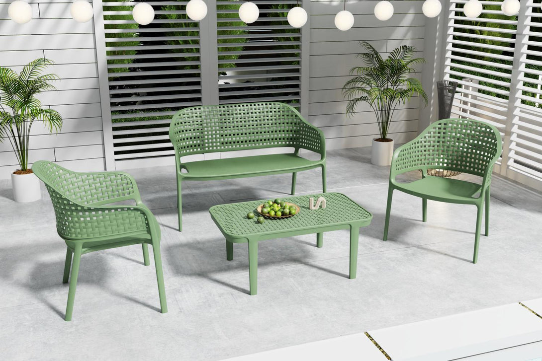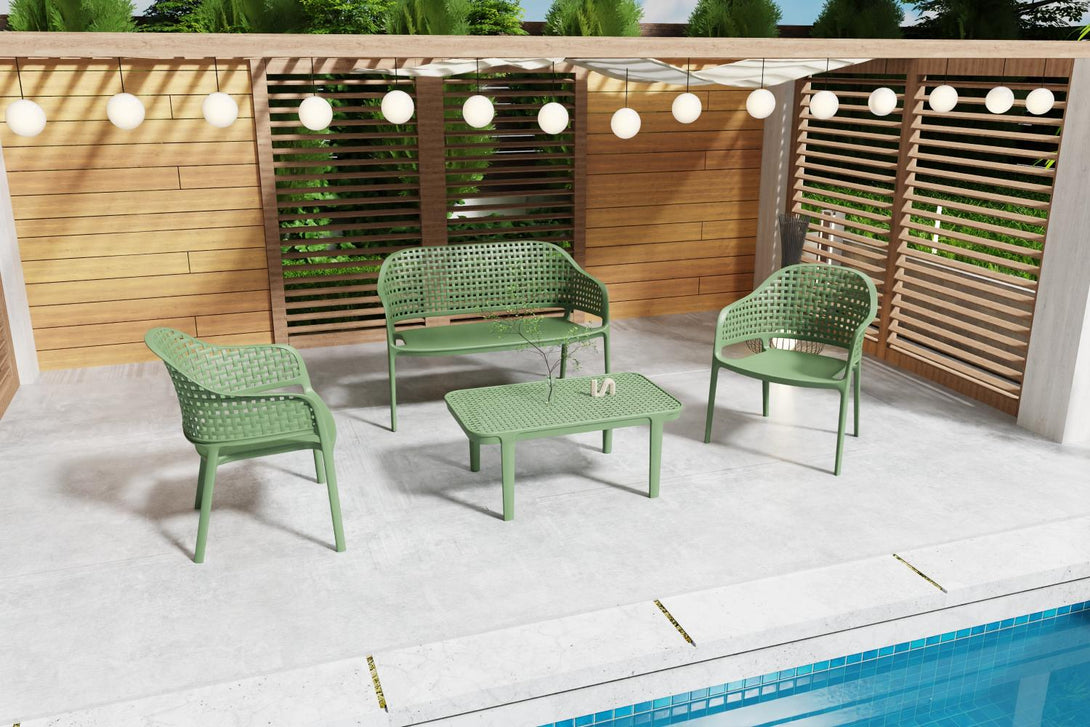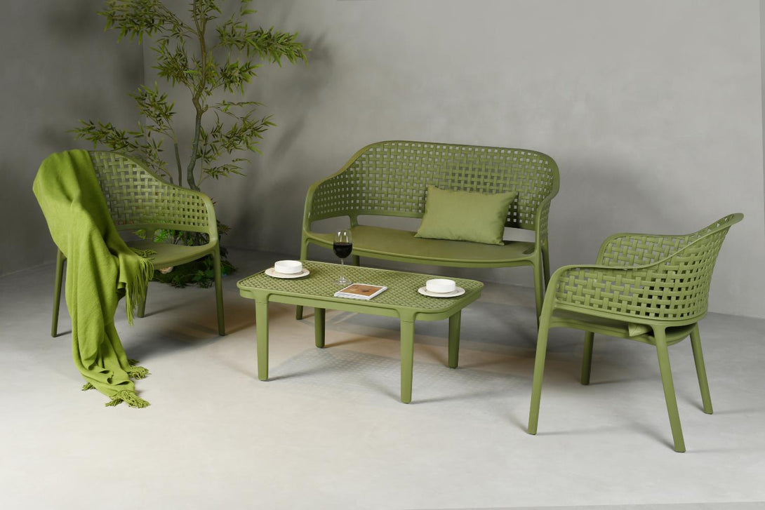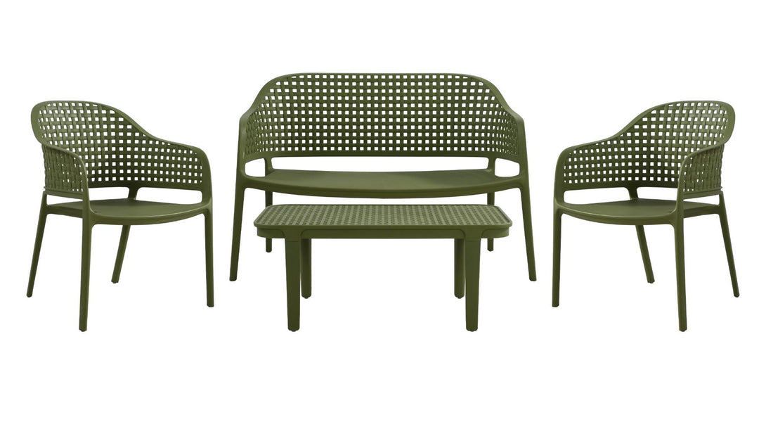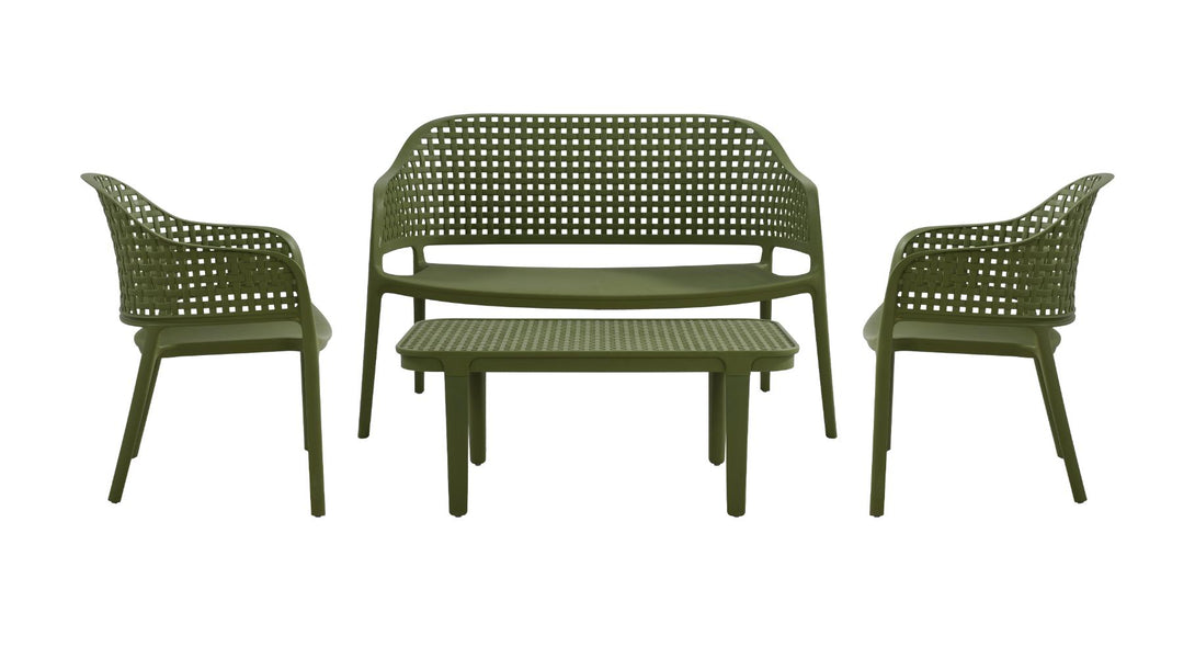 Elaborado en Polipropileno y protección a los rayos UV el set incluye mesa centro, dos sillas y un banco, en Color Verde Olivo