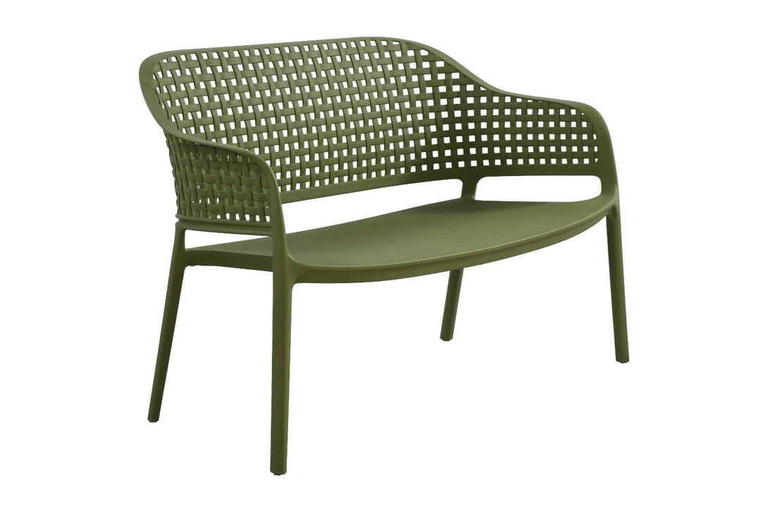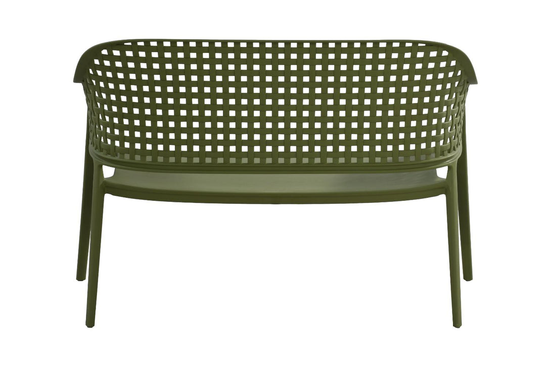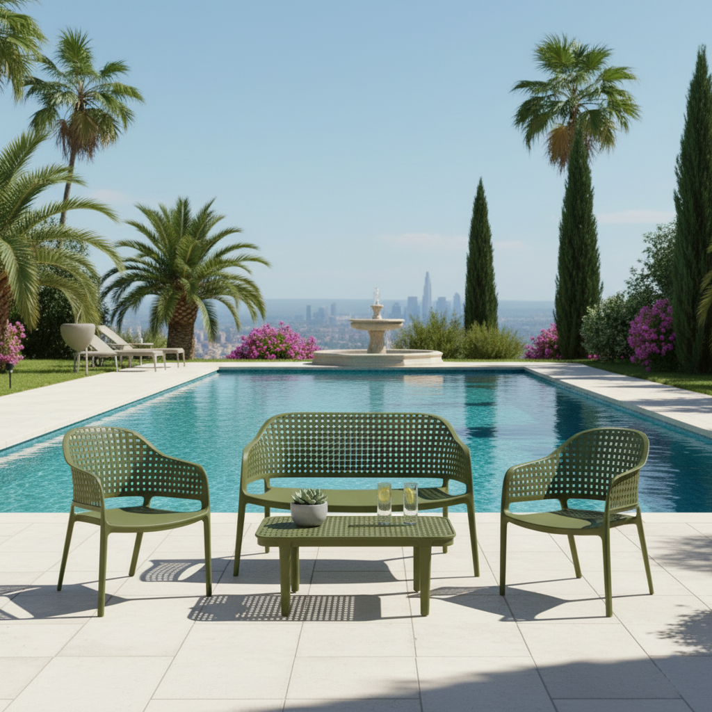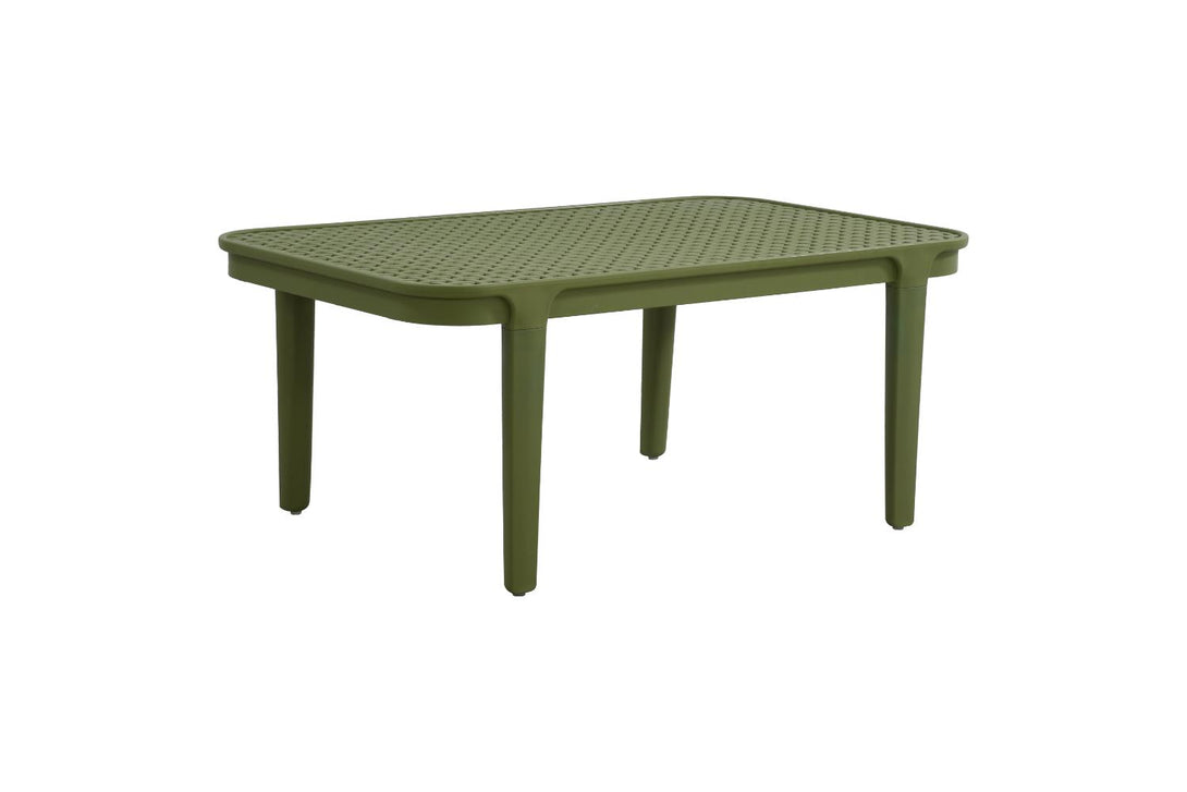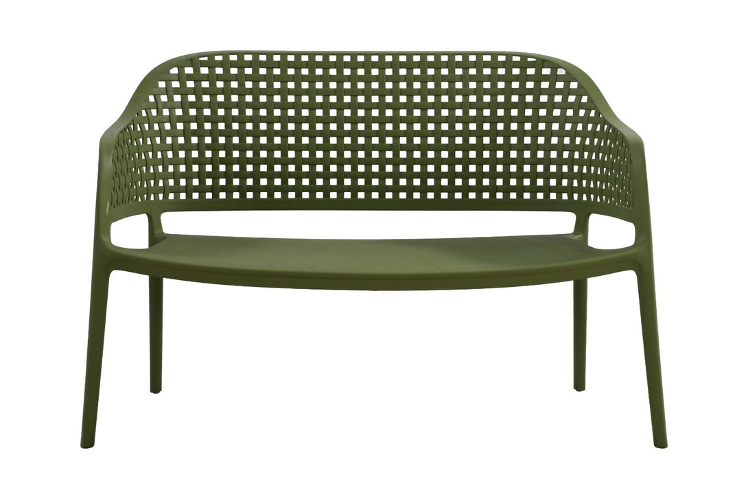 Elaborado en Polipropileno y protección a los rayos UV el set incluye mesa centro, dos sillas y un banco, en Color Verde Olivo